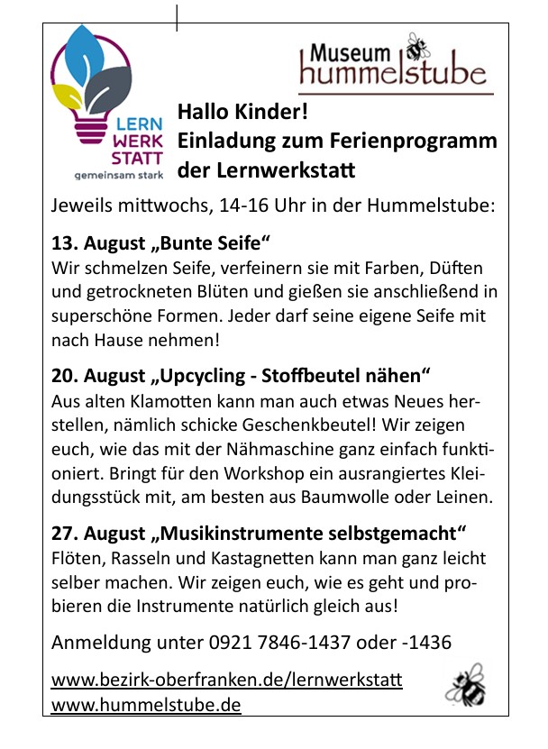 Hallo Kinder! Einladung zum Ferienprogramm der Lernwerkstatt Jeweils mittwochs, 14-16 Uhr in der Hummelstube: 13. August „Bunte Seife“ Wir schmelzen Seife, verfeinern sie mit Farben, Düften und getrockneten Blüten und gießen sie anschließend in superschöne Formen. Jeder darf seine eigene Seife mit nach Hause nehmen! 20. August „Upcycling - Stoffbeutel nähen“ Aus alten Klamotten kann man auch etwas Neues her stellen, nämlich schicke Geschenkbeutel! Wir zeigen euch, wie das mit der Nähmaschine ganz einfach funktioniert. Bringt für den Workshop ein ausrangiertes Kleidungsstück mit, am besten aus Baumwolle oder Leinen. 27. August „Musikinstrumente selbstgemacht“ Flöten, Rasseln und Kastagnetten kann man ganz leicht selber machen. Wir zeigen euch, wie es geht und probieren die Instrumente natürlich gleich aus! Anmeldung unter 0921 7846-1437 oder -1436 www.bezirk-oberfranken.de/lernwerkstatt www.hummelstube.de