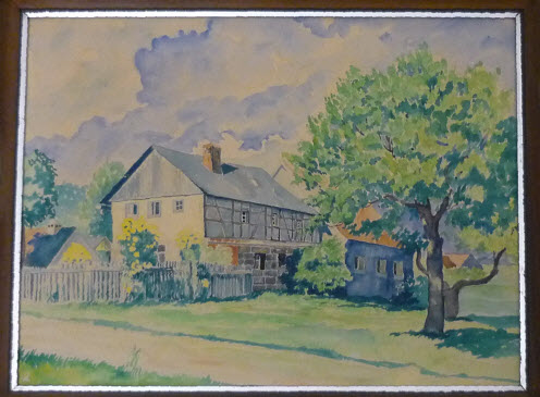 Innerhalb von zwei Generationen brachte die Familie Kertz drei bedeutende Maler hervor. Den Anfang machte Adolf Kertz (1880 – 1918), gefolgt von seinem Bruder Max (1882 – 1949). Dessen ältester Sohn Heinrich, 1904 in Nürnberg geboren, trat in die Fußstapfen seines Onkels und seines Vaters, indem er das Handwerk der Dekorationsmalerei erlernte. Ebenso wie sein Vater und sein Onkel vertiefte er seine handwerklichen Fähigkeiten bei einem Studium, das er 1922 an der Akademie der Bildenden Künste in Nürnberg aufnahm und 1925 in München an der Meisterschule für das Deutsche Malerhandwerk in München fortsetzte. Nach Ablegen der Meisterprüfung als Dekorationsmaler 1931 konnte er sein Handwerk nur kurze Zeit als freier Künstler ausüben, da ihm wegen der jüdischen Abstammung seines Großvaters während der nationalsozialistischen Herrschaft jedes öffentliche künstlerische Wirken untersagt war. Deshalb verlagerte er seinen künstlerischen Schwerpunkt nun auf Kleinformate wie Aquarelle und Zeichnungen. Als Motive wählte er unter anderem auch Landschaften, darunter Szenen aus dem Hummelgau. 9 Bilder – 8 Aquarelle, 1 Bleistiftzeichnung – mit Szenen aus dem Gebiet rund um Ochsenholz hat Heinrich Kertz’ Sohn Peter anlässlich der Eröffnung des Museums Hummelstube am 6.6.2009 dem Museum als Dauerleihgabe überlassen. Zu diesen Bildern zählt auch dieses Aquarell, welches den Titel „Bauernhaus der Familie Schill, die ‚Schmierhüttn’, Ochsenholz 20“ trägt und um 1939/40 entstanden ist. Es handelt sich dabei um das Stammhaus der Familie seiner Frau Marga, geb. Schill (1907 – 1991). 1950 starb Heinrich Kertz an den Folgen der Herzerkrankung, an der er seit seiner Kriegsgefangenschaft 1946 litt. Als Maler blieb Heinrich Kertz bis heute relativ unbekannt, da seine Bilder kaum ausgestellt wurden.
