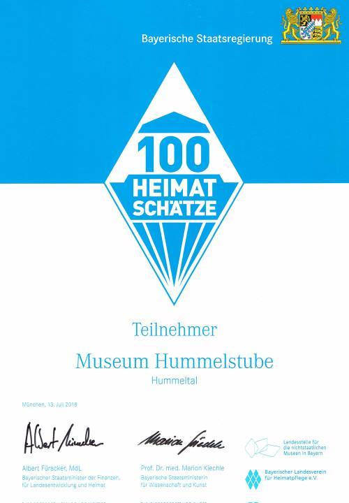 Unser Museum hummelstube und der Kaufmannsladen haben bei der Landesstelle der nichtstaatlichen Museen der Bayerischen Staatsregierung im Wettbewerb mitgemacht. Vier verschiedene Bilder hatten wir für den Wettbewerb eingesandt und sind nun unter den 100 Heimatschätzen im Juli 2018 geehrt worden. Die vorgeschlagenen Bilder zeigen unser Museum, den Kaufmannsladen, eine Tracht und eine Bierkanne mit Glas aus den frühen Jahren. Wir danken der Bayerischen Staatsregierung für die Teilnehmerurkunde.