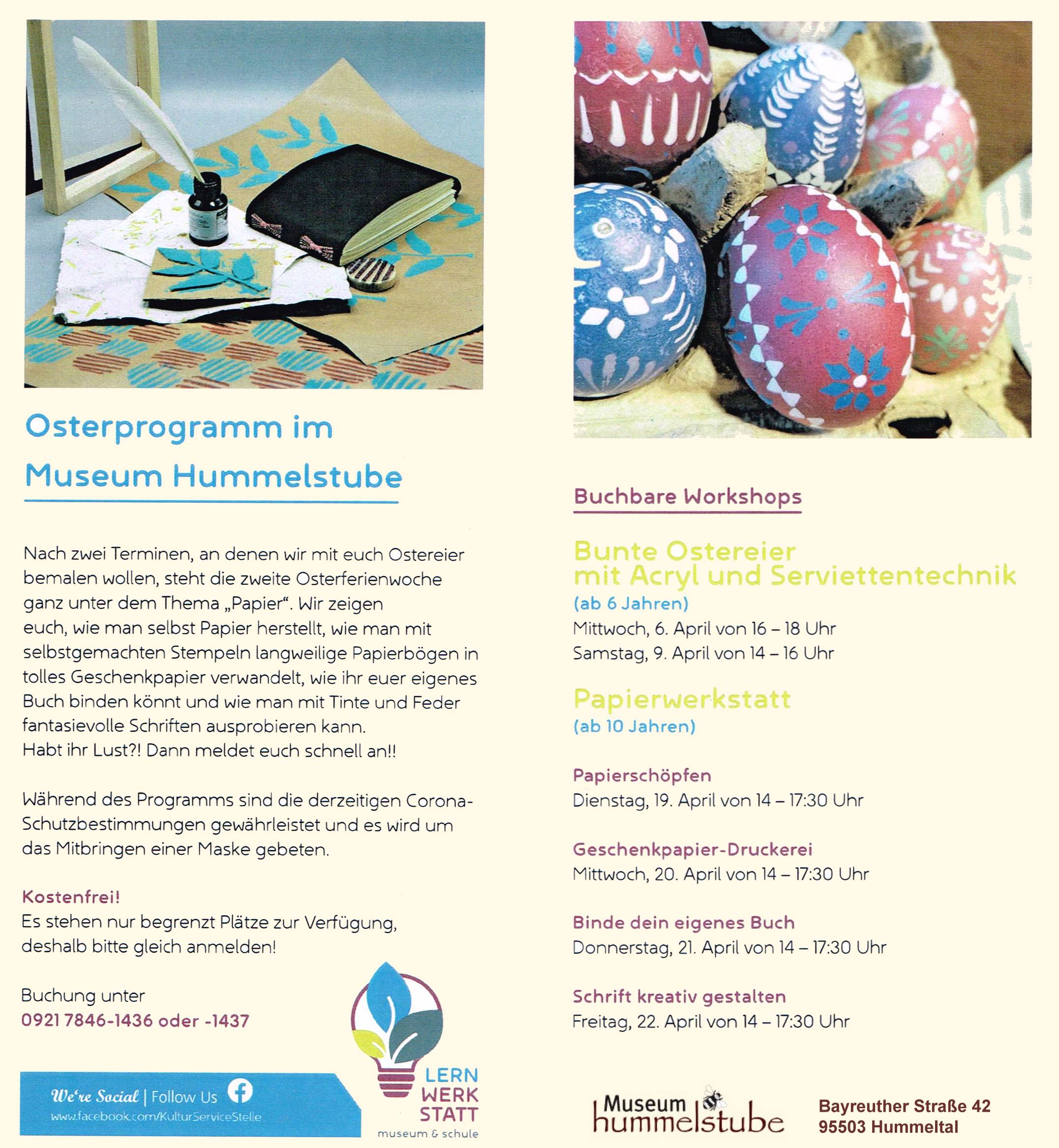 Unser Osterprogramm für Kinder in Zusammenarbeit mit der LernWerkStatt museum & schule Thema: Papierwerkstatt (ab 10 Jahren) Papierschöpfen: Dienstag, 19. April 2022 Geschenkpapier-Druckerei: Mittwoch, 20. April 2022 Binde dein eigenes Buch: Donnerstag, 21. April 2022 Schrift kreativ gestalten: Freitag 22. April 2022 jeweils von 14:00 bis 17:30 Uhr Buchung unter: 0921-7846-1436 oder 0921-7846-1437