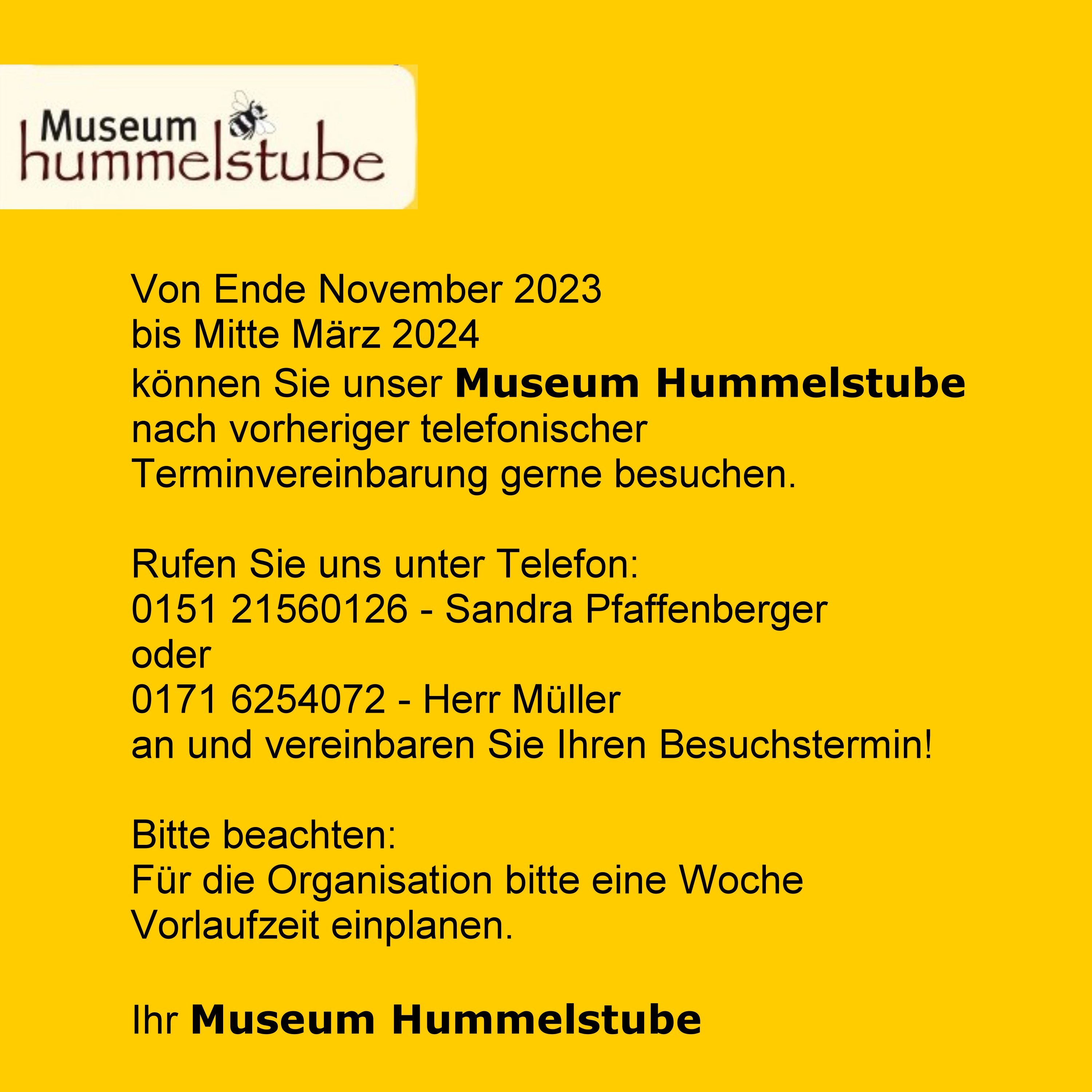Von Ende November 2023 bis Mitte März 2024 können Sie unser Museum Hummelstube nach vorheriger telefonischer Terminvereinbarung gerne besuchen. Rufen Sie uns unter Telefon: 0151 21560126 - Sandra Pfaffenberger oder 0171 6254072 - Herr Müller an und vereinbaren Sie Ihren Besuchstermin! Bitte beachten: Für die Organisation bitte eine Woche Vorlaufzeit einplanen. Ihr Museum Hummelstube
