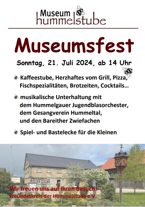 Museumsfest Sonntag, 21. Juli 2024, ab 14 Uhr Kaffeestube, Herzhaftes vom Grill, Pizza, Fischspezialitäten, Brotzeiten, Cocktails… musikalische Unterhaltung mit dem Hummelgauer Jugendblasorchester, dem Gesangverein Hummeltal, und den Bareither Zwiefachen Spiel- und Bastelecke für die Kleinen