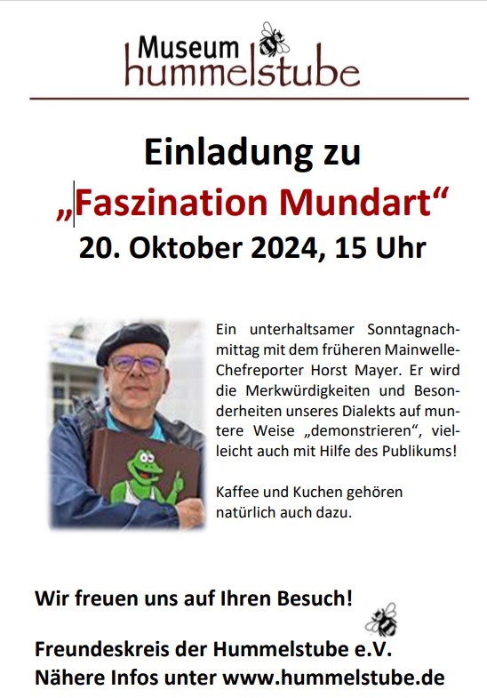 Der Freundeskreis der Hummelstube lädt zu einem unterhaltsamen Sonntagnachmittag mit dem früheren Mainwelle-Chefreporter Horst Mayer ins Museum ein. Bei Kaffee und Kuchen wird er die Merkwürdigkeiten und Besonderheiten unseres Dialekts auf muntere Weise „demonstrieren“, vielleicht auch mit Hilfe des Publikums! Man kann es nicht anders formulieren: Für Sprachliebhaber ist die Mundart in und um Bayreuth (ostoberfränkisch) eindeutig ein Paradies. Im Brennpunkt steht sofort, dass der Einheimische nur 24 Buchstaben braucht. Auf das „P“ und das „T“ kann er leichtfüßig verzichten. Hinzu kommen unzählige Merkwürdigkeiten beim Satzaufbau oder halsbrecherische Zeitkonstruktionen. Das Fränkische in unserer Region lebt zudem von einer unglaublichen Dominanz so genannter kleiner Wörter wie „schee“ und gscheit“, „fei“ und „gell“ - von „a weng“ ganz zu schweigen. Diesen Besonderheiten widmet sich der frühere Mainwelle-Chefreporter Horst Mayer in einer munteren – wie soll man sagen? - Demonstration, in der auch das Publikum mit einbezogen wird, lassen Sie sich überraschen. Zu unserem Museum „Hummelstube“ hat Horst Mayer einen besonderen Bezug. Mit Annemarie Leutzsch, der Rettl aus dem Hummelgau, hat er zwei CDs produziert, die jahrelang im Museum in Pittersdorf zugunsten des Fördervereins verkauft werden. Im Rundfunk hat er über zehn Jahre lang die Mainwelle-Mundartshow mit Frankenwürfel Träger Eberhard Wagner präsentiert. Horst Mayer ist außerdem Mitgestalter des mittlerweile vergriffenen Buches „Waafn dudd ma gern“, einer Art Lexikon Bayreuther Mundartbegriffe.