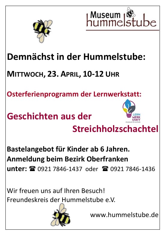 Demnächst in der Hummelstube: MITTWOCH, 23. APRIL, 10-12 UHR Osterferienprogramm der Lernwerkstatt: Geschichten aus der Streichholzschachtel - Bastelangebot für Kinder ab 6 Jahren. Anmeldung beim Bezirk Oberfranken unter: Tel. 0921 7846-1437 oder Tel. 0921 7846-1436 Wir freuen uns auf Ihren Besuch! Freundeskreis der Hummelstube e.V. www.hummelstube.de