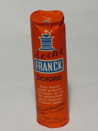 Eines der prominentesten Stücke aus unserem Tante-Emma-Laden ist mit Sicherheit der "Aecht Franck Zichorie". Es handelt sich um einen Kaffeezusatz bzw. Kaffeeersatz, der aus den gerösteten Wurzeln von Wegwarten (Wurzelzichorien) hergestellt wurde. Wahrscheinlich wurden Zichorien ab 1600 als Kaffee-Zusatz verwendet. Zichorien sollten dem Bohnenkaffee mehr Farbe und Bitterkeit verliehen, da Kaffeebohnen sehr teuer waren und Bohnenkaffee aus Sparsamkeitsgründen �gestreckt� wurde. Etwa ab den 1880er Jahren verdrängten Feigen- und Malzkaffee nach und nach den Zichorienkaffee. Zwar werden Zichorien auch heute noch Malzkaffeeprodukten zugesetzt (darunter �Caro� und �Linde�s�), reinen Zichorienkaffee erhält man heute jedoch nicht mehr. Bereits Ende des 18. Jahrhunderts bestanden einige Zichorienfabriken in Deutschland, vor allem in Preußen. In Württemberg gründete Johann Heinrich Franck 1828 eine Zichorienfabrik in Vaihingen/Enz. Wegen des für einen größeren Absatz notwendigen Eisenbahnabschlusses wurde das Stammwerk 1868 nach Ludwigsburg verlegt. In der Folgezeit wurden mehrere Zweigniederlassungen errichtet, darunter in Linz, Basel, Mailand, Bukarest, Kaschau (Tschechien), Flushing (nahe New York) und Skawina (bei Krakau). Nach mehreren Fusionen ging das inzwischen in �Unifranck Lebensmittelwerke GmbH� umbenannte Unternehmen 1984 in die Nestlé Maggi GmbH über. In Ludwigsburg verblieb das einzige Werk des ehemals großen Unternehmens, das noch an die traditionsreiche Kaffeemittelproduktion der Firmengründung anknüpfen kann. Der �Aecht Frank Zichorie� wurde in zylindrischer Form in roter Verpackung verkauft. Die Päckchen enthielten 200g Zichorienkaffee, der in 15 Tabletten gepresst war. Eine alte Mengenbezeichnung für eine Stückzahl von 15 ist die �Mandel�, daher wurde der �Aecht Franck� Zichorienkaffee auch �Mandelpäckla� genannt. In einigen älteren Aufzeichnungen finden sich bei der Nennung von Taufgeschenken oder Gaben für Wöchnerinnen neben Bohnenkaffee auch �Mandeln�, also Zichorienkaffee. Doch nicht nur der Inhalt des �Mandelpäcklas� war von Nutzen, sondern auch die Verpackung. Denn der rote Farbstoff der Verpackung ließ sich durch leichtes Anfeuchten leicht abreiben. So verliehen junge Frauen ihren Wagen etwas Farbe. Da das Gerücht umging, Lippenstifte bestünden aus Läuseblut, wurde das Rot des Zichorienpapiers auch als Lippenstiftersatz benutzt.